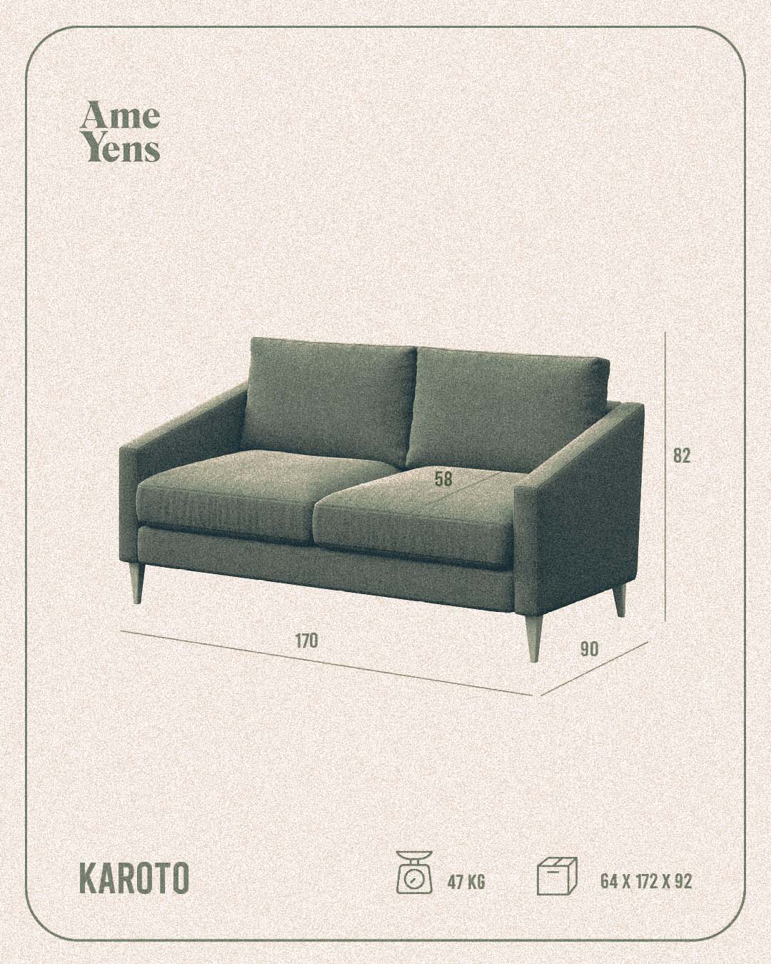Kolekcja KAROTO oferuje fotel, sofę dwuosobową, sofę trzyosobową oraz narożnik. Wszystkie meble z kolekcji charakteryzują się elegancką, symetryczną formą, nawiązującą do stylu lat 60. i 70. Charakterystyczną cechą zestawu są fazowane podłokietniki. Drewniane nogi sofy w formie ściętych pod kątem słupków optycznie wysmuklają mebel. Dodatkowo, podzielona na dwie części powierzchnia siedziska i oparcia nawiązuje do podwójnej formy podstawy i poduszek siedziska. Prosta, minimalistyczna forma mebla sprawia, że dzięki odpowiednio dobranym materiałom znajdzie on zastosowanie w każdym stylu wnętrza. Sofa KAROTO podkreśla wszystkie cechy kolekcji, czyli minimalizm i symetrię w nowoczesnej interpretacji mebli w stylu retro.