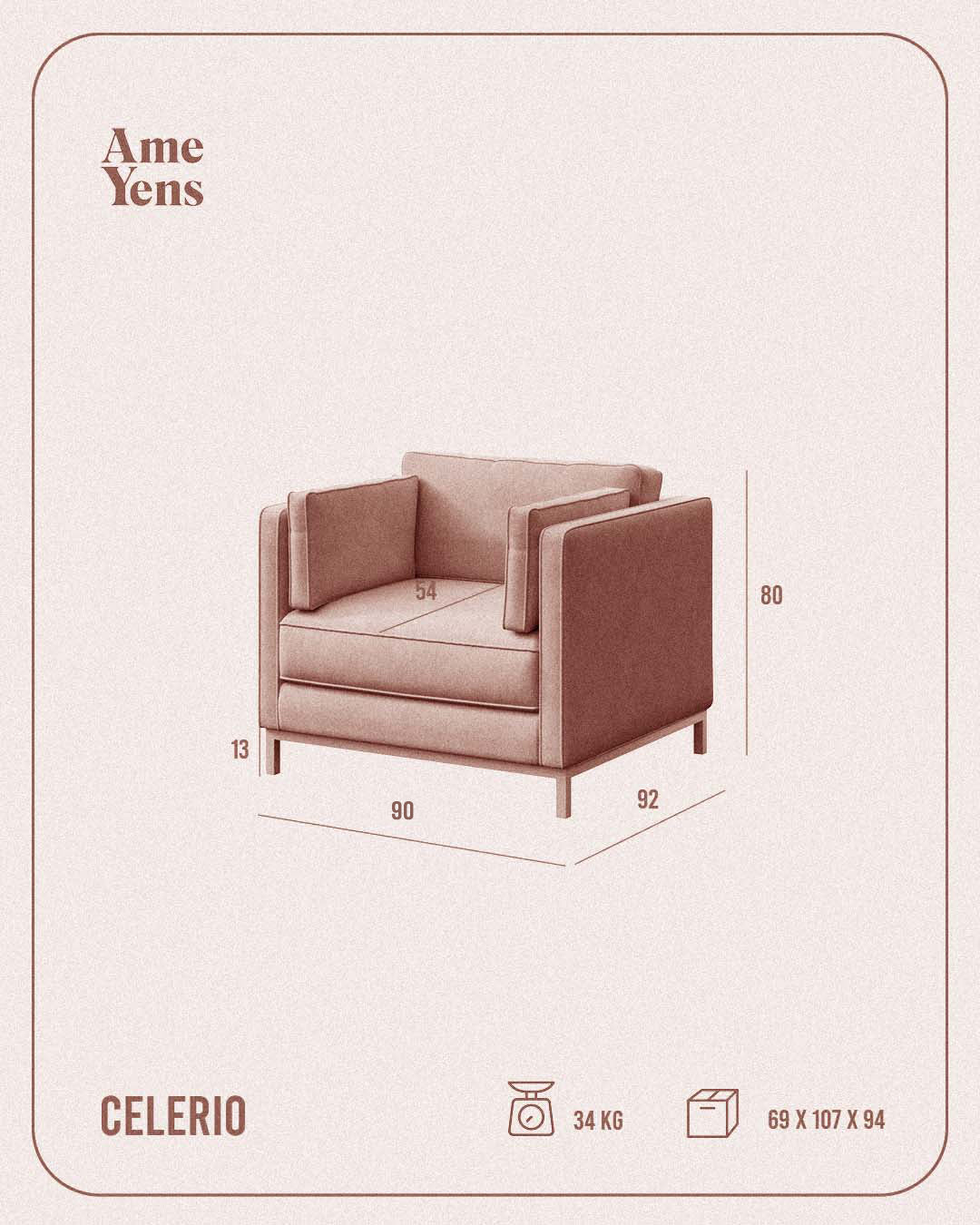 CELERIO to kolekcja charakteryzująca się eleganckim, minimalistycznym i symetrycznym designem. Poduszki sofy mają regularne wymiary, co podkreśla symetryczny i przemyślany design. Oparcie jest podzielone na dwie części. Grubość poduszek powtarza wymiary siedziska. Całość opiera się na cienkiej drewnianej ramie z jasnego, naturalnego drewna, wykończonej prostymi nogami o grubości ramy. Po obu stronach sofy znajdują się dodatkowe poduszki.