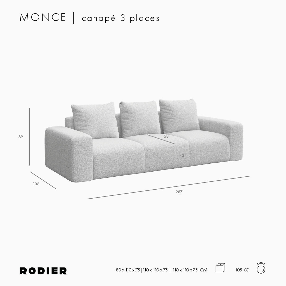 Odkryj trzyosobową sofę Monce, mebel z eleganckiej i ponadczasowej kolekcji Rodier o zaokrąglonym kształcie i zrównoważonych wymiarach, który w wyjątkowy sposób wzbogaci Twoją przestrzeń życiową. Jej forma dzięki miękkim, zaokrąglonym liniom przywołuje poczucie relaksu i komfortu. Dodatkowo, wygodna, a zarazem sprężysta pianka siedziska sofy zapewnia doskonałe podparcie.